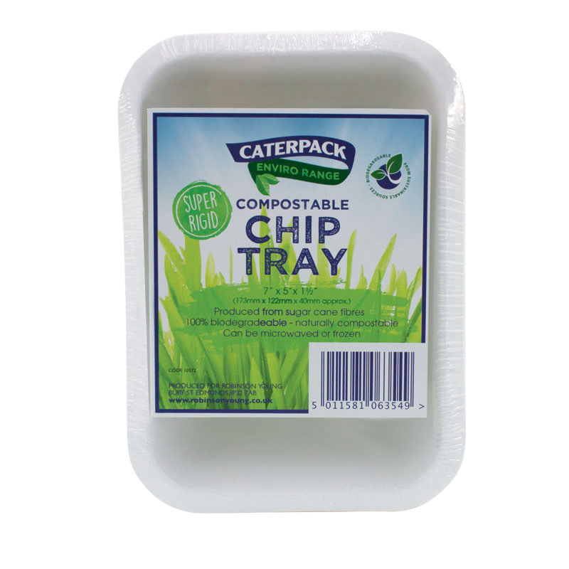 Versatile eco chip tray, for all hot or cold food to go, bagasse with recycled sugarcane fibre.